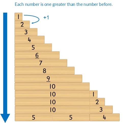 Placing blocks end-on-end is an alternative representation when counting forwards. Encourage students to start with the one and add blocks to the right, as per the direction of a number line.
