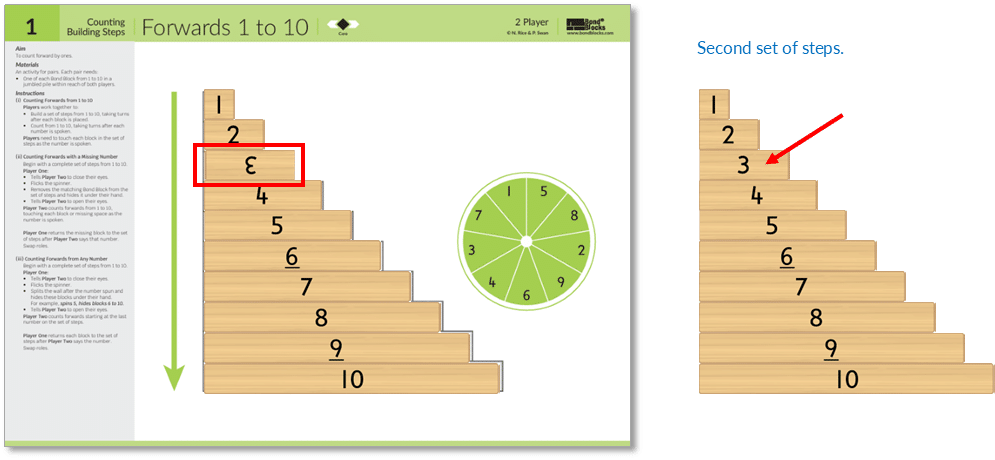 Build steps from one to five. Start with the 1 block. Build flat on a desk. Count aloud, pointing to each number as it is said.