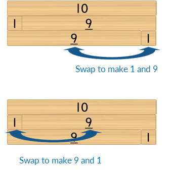 - Then place the 1 block underneath the 10. Ask the student, “Which number joins with 1 to make it the same as 10?” Model saying the bond, whilst touching the related blocks, “Yes, 1 and 9 is 10”