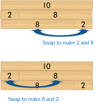 Represent the commutative propert of addition by focusing on one two-part bond at a time. Use the 10 block as the whole.