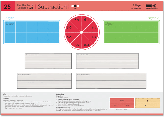 Play Five Plus Bonds: Subtraction Building A Wall to develop fluency verbalising the wholes of 6,7,8,9 as five plus bond subtraction equations.