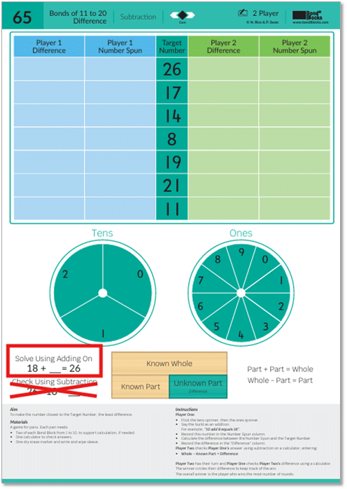 After the final round each player calculates their overall difference by adding all of their difference scores from each round, without using a calculator. The player with the overall lowest overall difference is the winner. Bond Blocks can be used to support calculations where needed. Each player checks the other player’s total difference using a calculator.